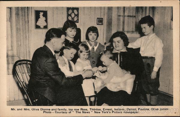 Front: Mr. and Mrs. Oliva Dionne and family, top row Rose, Thérèse, Ernest, bottom, Daniel, Pauline, Oliva junior. The News New York's Picture newspaper. Courtesy of Photo Back: CARD POST MADE IN CANADA CO BOTTAWA PHOTOGELATINE ENGRAVING CYL OTTAWA