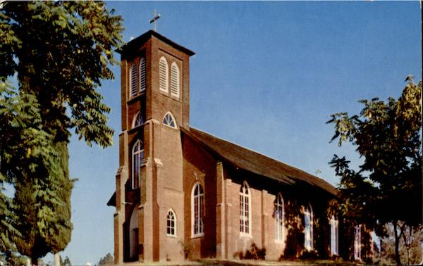 Still standing high on a hill, this is thought to be the first brick church in California. Father Slatterly was the first priest, when the church was completed in 1856. The bell, at a cost of $1500, was brought around the "Horn" and added to the belfry in 1857. |