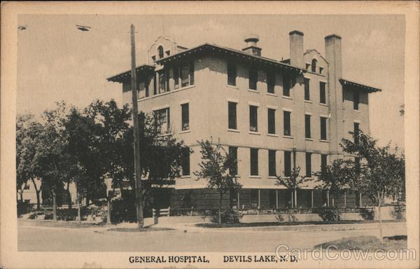 Front: IHII DEVILS LAKE, N. D. GENERAL HOSPITAL, Y AR Back: POSTCARD Quolity Cine $Bloom Bros.Ca inneapolis 14 Pub. for RAMSEY DRUG CO., Devils Lake, N. D.