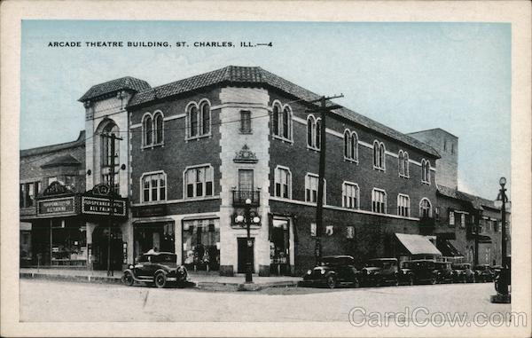 Front: ARCADE THEATRE BUILDING, ST. CHARLES, ILL.-4 SPEAKE ALL TAL Back: М-1394 с posT CARD PLACE OST ONE CENT STAMP HERE FIVE CENTS TO ANYWHERE N U.S. VI AIRMAIL Co к PUB. BY LESLIE S STORES