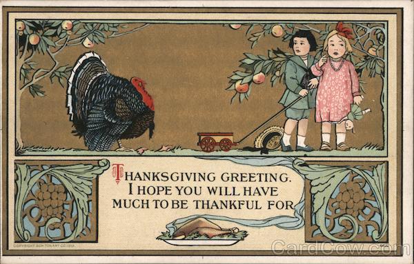 Front: HA THANKSGIVING GREETING. I HOPE YOU WILL HAVE MUCH TO BE THANKFUL FOR CORYRIGHT BON TON ART COJS CG.Jr. Back: Золуп ART