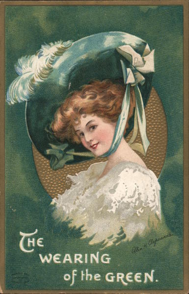 Front: НЕ WEARING of the GREEN. Back: POST CARD PLACE POSTAGE STAMP FOR ADDRESS ONLY FOR CORRESPONDENCE HERE Hith mag hnkaumas Seercly Printed in Germany.