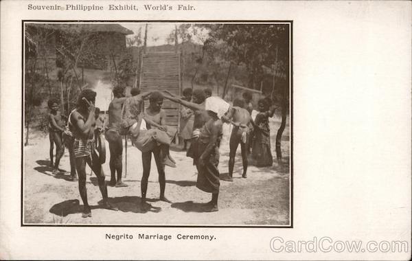 Front: Souvenir Philippine Exhibit, World's Fair Negrito Marriage Ceremony. OGA BH Back: -da el/toV31d1dz sdcelliddtu 15- PLACE 120 POST CARD POSTAGE STAMP HERE THIS SIDE FOR THE ADDRESS