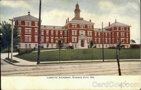 Front: LORETTA ACADEMY, KANSAS CITY, Mo. g.. Back: Publ. by Webb-Freyschlog Merc. Co. FOREIGN, TWO CENTS. THIS SIDE FOR THE ADDRESS.