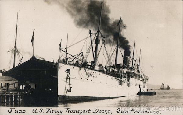 Front: SRMAN U.S. Army Transport Docrs, San Francisco , 222 Back: POST CARD A A PLACE A A STAMP HERE NO CORRESPONDENCE HERE NAME AND ADDRESS HERE N 0 10 N O