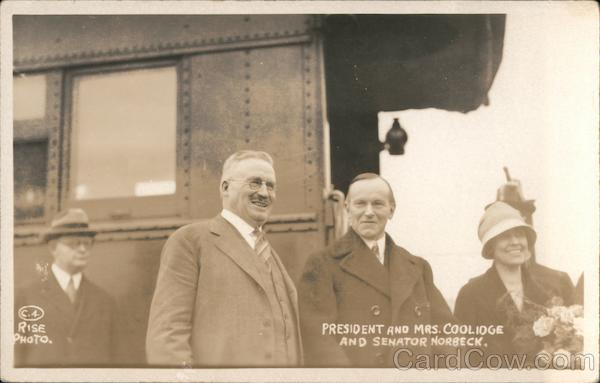 Front: C.4 RISE Рното. PRESIDENT ANO MRS.COOLIDGE AND SENAToR NORBECK Back: RTA ET POST CARD PLACE STAMP HERE S S CORRESPONDENCE ADDRESS 118 SA