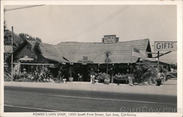 Front: POWERS URN SHOP GIFTS ifts NOVSL TIES STEPPING STONES HOUR'S FONONG TO HANCNG BASKETS DISPLAY POJO OTTERY DIS NOVELTIES GIFTS ORNAGEN BATHS POWER'S URN SHOP, 1890 South First Street, San Jose, California Back: POST CARD ADDRESS CORRESPONDENCE