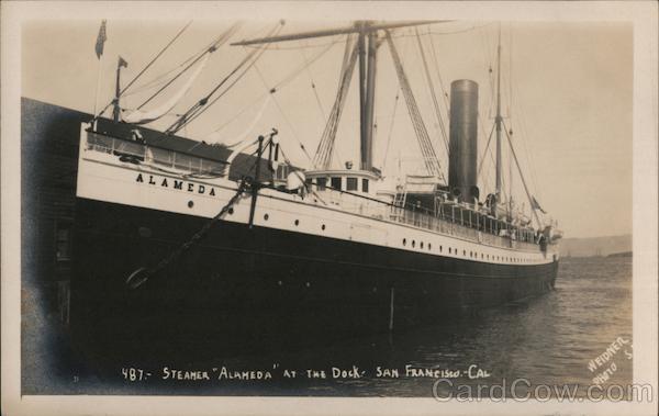 Front: ALAMEDA ee t 487- STEAMER ALAMEDA AT THE Dock SAN FRANCISEd.-CAL WEIDNER PHOTO S Back: e 25 RTUR4 POST CARD PLACE STAMP HERE FOR MESSAGE FOR ADDRESS ONLY ARTUR RTURY RTURA