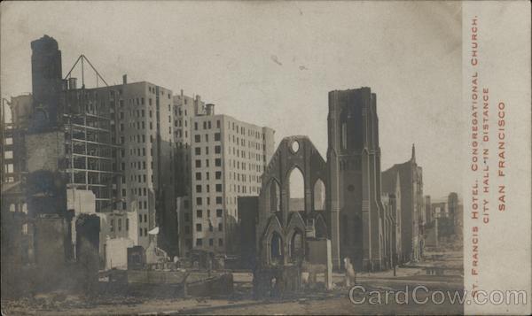 Front: ST. FRANCIS HOTEL. CONGREGATIONAL CHURCH. CITY HALL IN DISTANCE SAN FRANCISCO Back: POST CARD Place Stamp Here Domestic One Cent Nothiug but address on this side Foreign Two Cents O MADE BY PHOTO. CO. OF AM., CHICAGO HAQX
