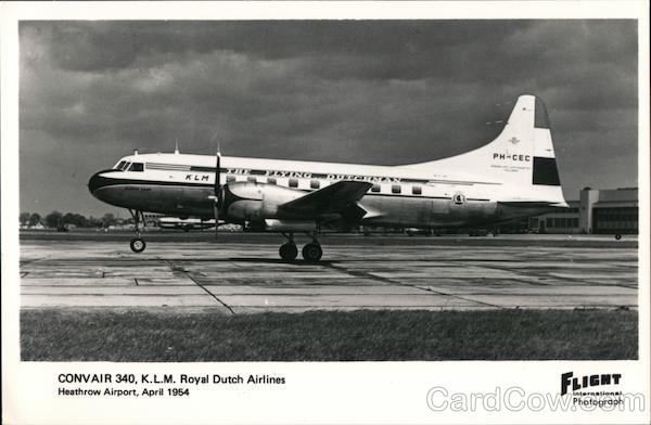 Front: PH-CEL KLM NGDUTOMA CONVAIR 340, K.L.M. Royal Dutch Airlines Heathrow Airport, April 1954 LIGNT International Photograph Back: POST CARD CORRESPONDENCE ADDRESS