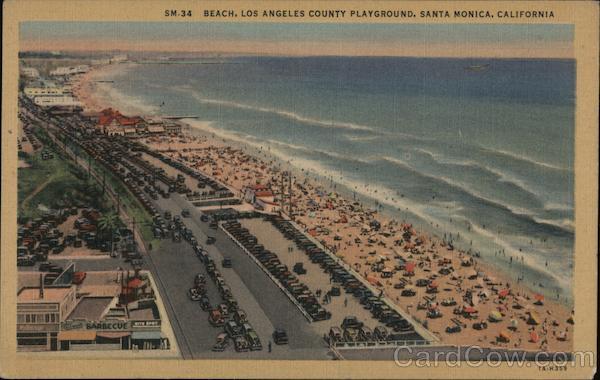 Front: SM-34 BEACH, LOS ANGELES COUNTY PLAYGROUND, SANTA MONICA, CALIFORNIA CNTHEN BARBECUE SPOT 1A-H359 Back: PLACE ONE CENT STAMP HERE POST CARD WESTERN PUBLISHING & NOVELTY co., LOS ANGELES, CALIF. c.T.ART-COLORTONE REG. U.S. PAT. OFF.
