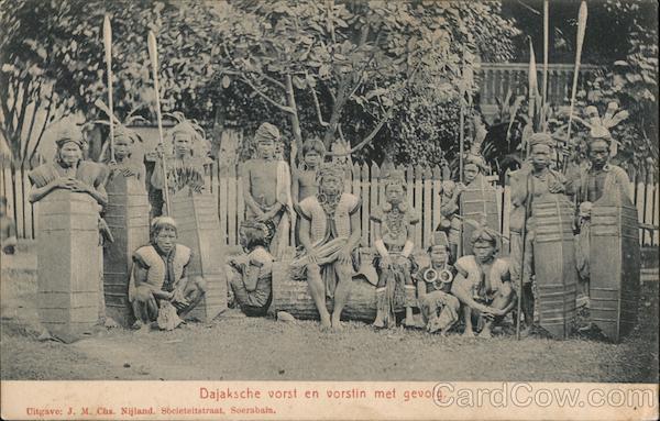 Front: Dajaksche vorst en vorstin met gevolg. Uitgave: J. M. Chs. Nijland. Societeitstraat, Soerabaia. Back: Briefkaart Kartoe 00 Adres Alamat leeln balui 9Alamchs SIN a Start Batan malehme 3so miles Wuh were alo %.m ahaee
