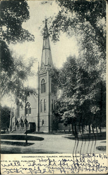 Front: CONGREGATIONAL CHURCH, MELROSE, MASS 017-E. M. KEEN, PUBLISHER. Hope well. Thanks for sent. 8,06 ll are mail Back: 33 POSTSECARD MELROSE 6-30P 61 06 UNITED STATES OF STATION 1706 RANKLIN miss 2. W. Kales, 110 Pine St., Portland, me.