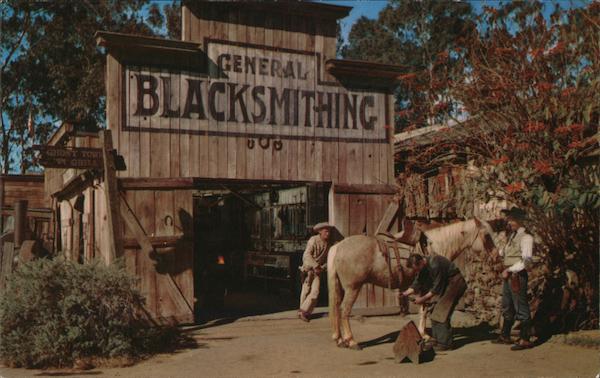 WELLS FARGO & CO EXPRESS POST OFFICE KNOTT'S BERRY FARM Ghost Town, California Sim The cowboy naps while the blacksmith shoes his horse at the Blacksmith Shop in Ghost Town at Knott's Berry Farm, Buena Park, California. address ARAYA KBF-43