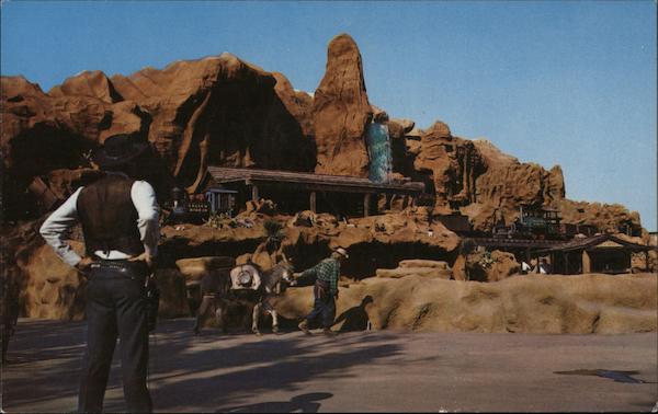 | The Sheriff looks with amazement at the mountain inside of which Calico Mine Co. blasts and digs out Gold and Silver Ore. In the mountain are also wondrous underground caverns and steam geysers. Open to the public via the Calico Mine Co. ore train. |