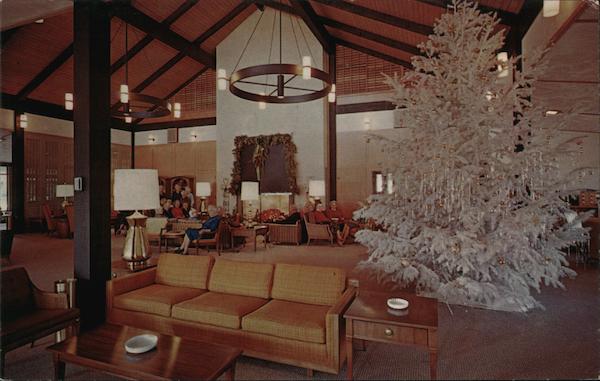 A Retirement Community owned and operated by Northern California Presbyterian Homes, Inc. The Main Lounge at Christmas. This beautiful lounge is in the Administration Building. There are four smaller lounges located at important points throughout the grounds each with its own library, kitchen and laundrette. October 8, 1962. |