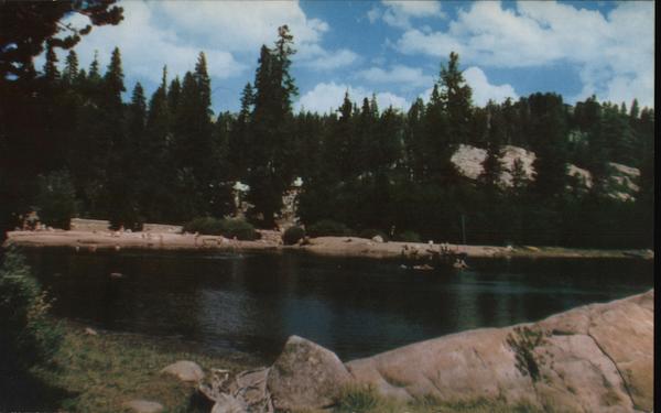 TURAL SWIMMERS Swimming at LAKE ALPINE, California, on Ebbetts Pass Highway in the High Sierra. Lodging, Store, Gasoline and Public Camping available. 010 Mike Roberta BERKELEY 2, CALIF. SC7284 Color Photo by B. L. Winslow