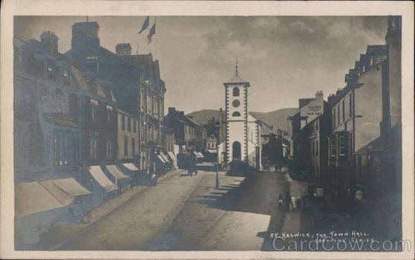 Front: GREENHOWS HOTEL JS ALUNSON CROCER BACON CURED 88. KESWICK, THE TOWN HALL. ABRAHAMS' SERIES Back: This Card is an actual Photograph by a P. ABRAHAM, F.K.PS. Keswick (Copy ight) POST CARD Written Here The Address only to be Britais. Printed