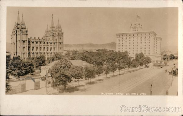 Front: MH 1 mu 1 10 1 ' ' 1 3. MORMON TEMPLE AND HOTEL UTAH, Back: POST CARD Azo A PLACE A 2 STAMP O HERE O A 2.0 CORRESPONDENCE ADDRESS