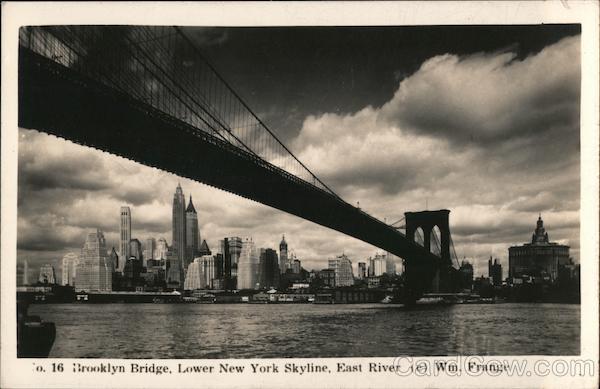 Front: P Co. 16 Brooklyn Bridge, Lower New York Skyline, East River (c) Wm. Frange Back: Aug. 1936 DO POST CARD PLACE STAMP HERE CORRESPONDENCE ADDRESS
