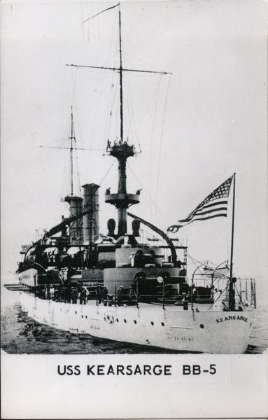 Front: KEARS ARGE USS KEARSARGE BB-5 Back: IX 16 2. 20-1900 5-10-1920 LDC DESIGN CHANGGO ON 11-6-41 TO CRANE SHIP #1 SCRAPPLD AUGUST 1955 ADDRESS CORRESFONDENCE Post Card