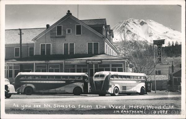 Front: WEED TOFU GREYHOUND BUS DEPOT AIR CONDITIONED 2 017 NO AIR CONDITIONED "As you see Mt, Shasta from the Werd Hotel, Weed, Calif. B 1975 J. H EASTMAN Back: Kodak-- PHOTO POST CARD June 1950 E-Paper-- ADDRESS ate here at 12:30
