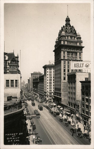 Front: SO KELLY G MUTUAL SAVINGS BANK SERANSEN. SUIOC Moon MARKET ST AT GRANT S. F. CAL. Back: POST CARD CORRESPONDENCE ADDRESS ONLY