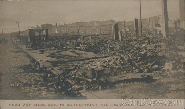 Front: 2300 FROM VAN NESS AVE. TO WATERFRONT, SAN FRANCISCO. THREE MILES OF RUINS. Back: POST CARD Place Stamp Here Nothing but address on this side Domestic One Cent Foreign Two Cents COPYRIGHT. 1906, BY PHOTO.CO. OF AM., CHICAGO