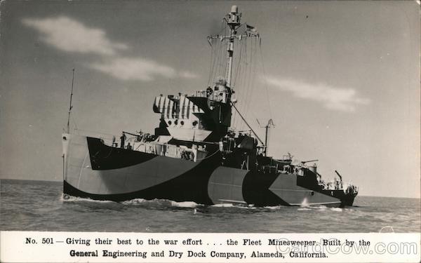 Front: No. 501 — Giving their best to the war effort ... the Fleet Minesweeper. Built by the General Engineering and Dry Dock Company, Alameda, California. Back: Post Card Pa@ud PLACE STAMP HERE ADDRESS
