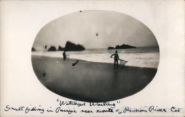 Front: "Watchful Walking" Smelt fishing in Pacific rear mouth of Russian River Cul Back: POST CARD AZ A PLACE A z STAMP z o HERE O 0 A AZ CORRESPONDENCE HERE NAME AND ADDRESS HERE LAND) Eunos olh mon