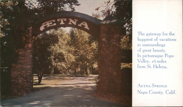 Front: ETNA The gateway for the happiest of vacations in surroundings of great beauty. In picturesque Pope Valley, 16 miles from St. Helena. AETNA SPRINGS Napa County, Calif. Back: POST CARD AETNA SPRINGS ยท NAPA COUNTY, CALIF. |