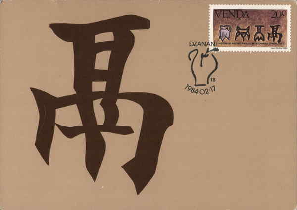 Front: VENDA 209 DZANAN HISTORY OF WRITING:EVOLUTION OF CHINESE CHARACTER A2 Hein Botha 1984 18 1984 02-11 Back: VENDA TIME MAXIMUM CARD Postage stamps on back Postcard FOR ADDRESS ONLY CHINESE CHARACTER HISTORY OF WRITING 1984-02-17