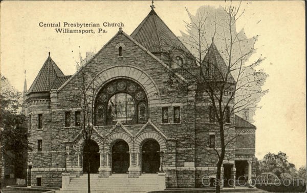 Front: Central Presbyterian Church Williamsport, Pa. Back: Ype Lye - Wrest AN STA JAN P.M. Seda to Stafel 75 1912 Miss Hazel Schom &ogan Station: Qa