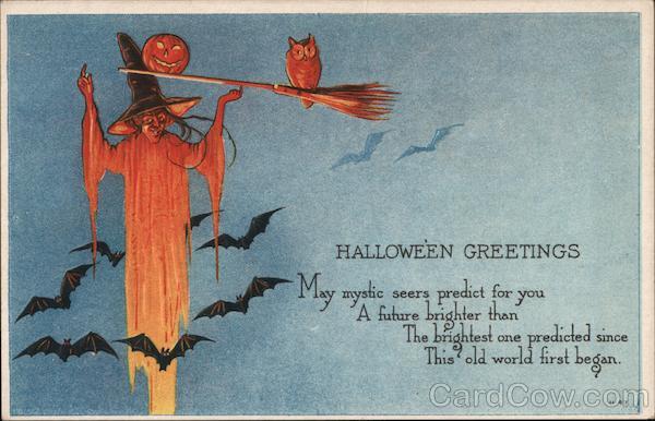Front: HALLOWEEN GREETINGS May mystic seers predict for you The brightest one predicted since This? old world firs "A future predict for you beban Back: POST CARD. CORRESPONDENCE ADDRESS XAN MADE IN U.S.A.