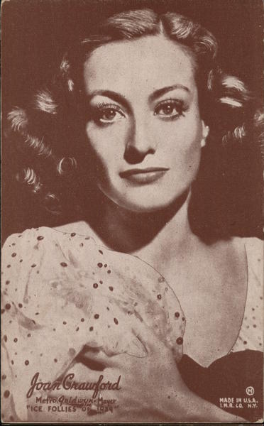 Front: Joan Grauford Metro Calduro Mayer lice FOLLIES OF 1939 MADE IN U.S.A. 1.M.R.CO. N . Back: 2 Sve MPOSTCARDS PLACE POSTAGE STAMP HERE PRINTED IN U. S. A. THIS SIDE FOR CORRESPONDENCE THIS SIDE FOR ADDRESS ONLY A MUTOSCOPE CARD