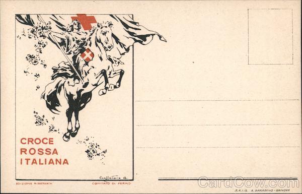 Red Cross. Croce Rossa Italiana. Woman on horse with red cross shield and flag