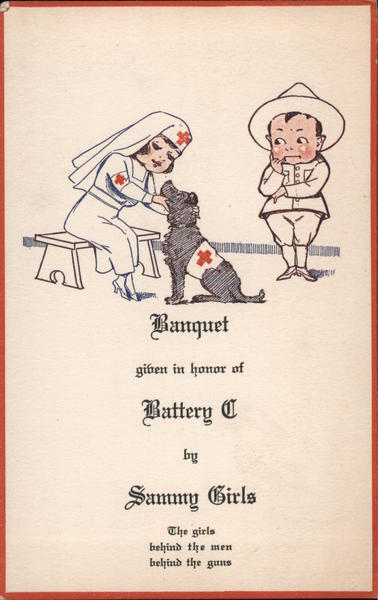 Front: HEWAN Banquet given in honor of Battery C Sammy Girls The girls behind the men behind the guns Back: 5 Red Cross. Menu Just a good old home cooked dinner without macaroni and beans but with chicken and pumpkin pie. #