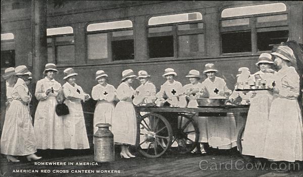 Front: 00000 088882 SOMEWHERE IN AMERICA AMERICAN RED CROSS CANTEEN WORKERS Back: DISTRIBUTED BY THE AMERICAN RED CROSS PLACE A TWO CENT STAMP CANTE TEEN OUD HERE SERVICE