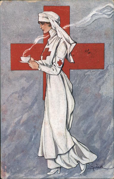 Woman in Red Cross uniform holds a tea cup and saucer in front of large red cross.