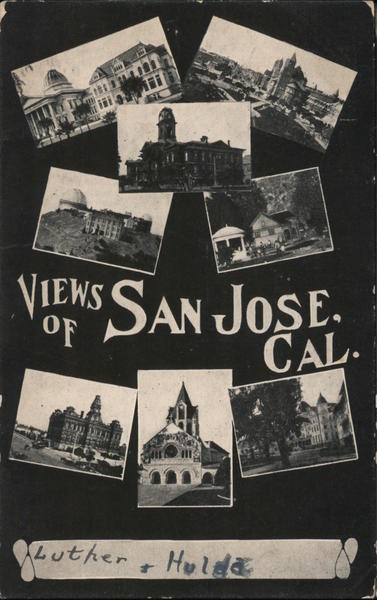 Front: VIEWS VIEWS SAN JOSE OF buther & Hulda Back: NUVENSTVENO Posts Card GAL. THIS SIDE IS FOR THE MPDRESS ONLY ANKLIN 1790 O FRANK y Mr. Elbert Charmann Oregon City Oregon. Box 21.