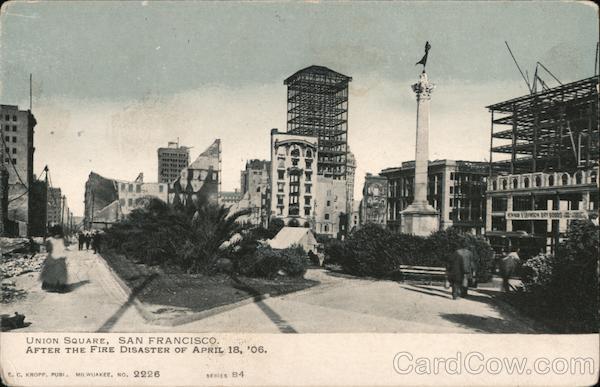 Front: OV UNION SQUARE, SAN FRANCISCO. AFTER THE FIRE DISASTER OF APRIL 18 P06. E. C. KROPP, PUBL. MILWUAKEE, NO. 2226 SERIES B4 Back: PLACE STAMP HERE Post Card DOMESTIC ONE CENT FOREIGN TWO CENTS THIS SIDE IS FOR THE ADDRESS.