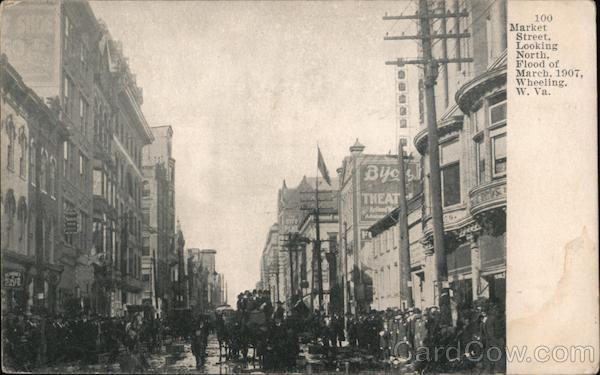 Front: 100 Market Street, Looking North, Flood of March, 1907, Wheeling, W. Va. Bija DO Back: Nicoll's Art Store, Wheeling, W. Va. Post Card TWO CENTS FOREIGN ONE CENT DOMESTIC HERE PLACE STAMP