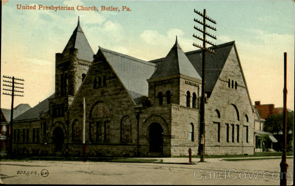 Front: United Presbyterian Church, Butler, Pa. 205,989 ושר Back: The Valentine & Sons Publishing Co., Ltd., New York JT Correspondence. BUTLER FAMOUS V& SONS 75 CARD. THROUGHOUT THE WORLD- Address Only.