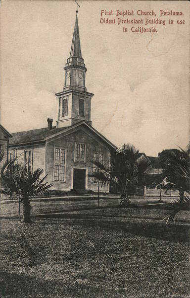 Front: First Baptist Church, Petaluma. Oldest Protestant Building in use in California. Back: This Space For Writing Messages. Place Stamp Here Post Carol Domestic One cent Foreign Two cents Made in Germany. SZ СО. This side for the Address only.