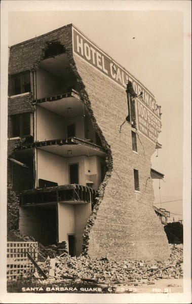 Front: 11 SANTA BAR BARA QUAKE Back: POST CARD A室 A PLACE A z STAMP 3 o HERE ADDRESS DAH CORRESPONDENCE
