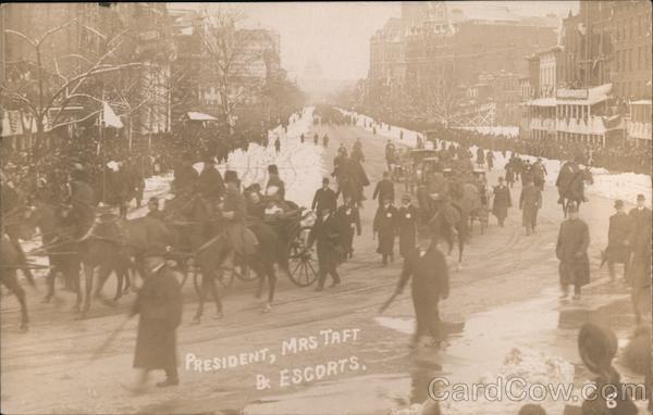 Front: PRESIDENT, MRS TAFT B ESCORTS, Back: TARY INAGUAR AL 35- POST CARD AA 20 A A PLACE A STAMP o HERE O A A zo A CORRESPONDENCE HERE NAME AND ADDRESS HERE