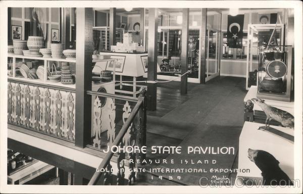 Front: _A JOHORE STATE PAVILION TREASURE ISLAND GOLONGATE INTERNATIONAL EXPOSITION Moulin 93 STUD10 Back: POST CARD PLACE STAMP HERE CORRESPONDENCE ADDRESS