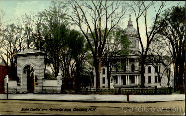 Front: State Capitol ana Memorial Arc㎝, Concord, N.H. 40/10 Back: W. C. Gibson, Books and Stationery, Concord, N.H. SOUVENIR POST GARD Correspondence. ог
