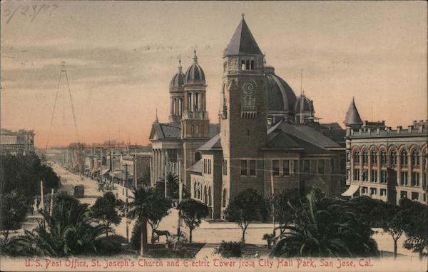 U.S. Post Office, St. Joseph's Church and Electric Tower from City Hall Park, San Jose, Cal