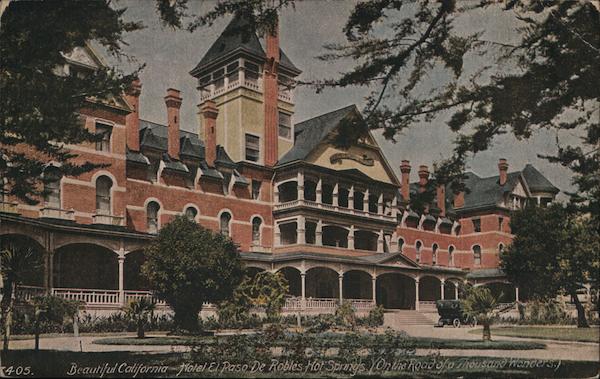 Front: **** SE Beautiful California lotel El Paso De Robles Hot Springs YOnthe Rocd of0 Thousand Wonders. 405. Back: POS CARD --EDWARD H. MITCHELL, PUBLISHER, SAN FRANCISCO-